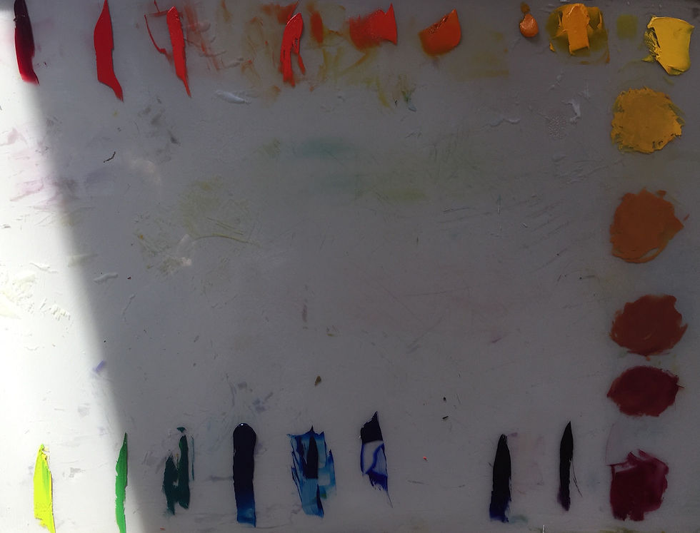 This week my students and I have been talking and thinking about how to create a wheel of colour from a first split primary palette using only 6 pigments. Having done this I have been exploring how these colours relate to one another, because as artists this is paramount to good painting outcome. Our eyes tend to try to balance colour naturally this means they try to see a colours compliment this is what creates a harmonious colour way and what makes us feel uneasy or challenged. Yes I am a believer that colour really is that powerful at a conscious and subconscious level.