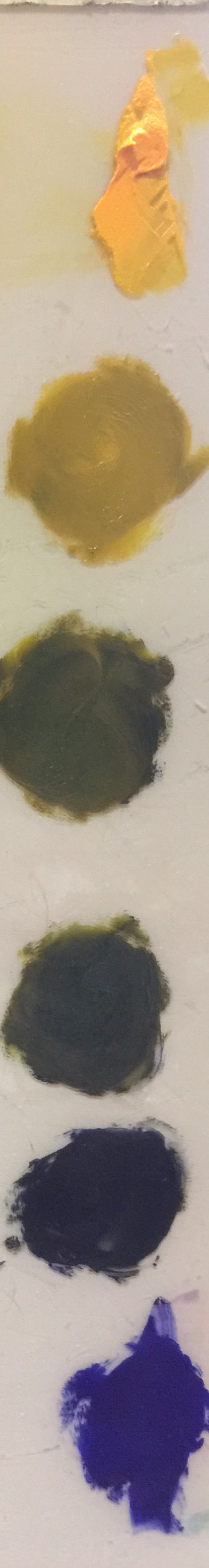 Once the colours with their compliments are laid out opposite each other i have mixed from one to the other in 4 stages.Below I have shown you how I have used a square tip knife tool to pick up a pile of yellow and gently wipe four decreasing amounts of yellow in each one and doing the same with the violet, this then makes it easy to mix and I do this form lightest colour to the darkest as you can see below.