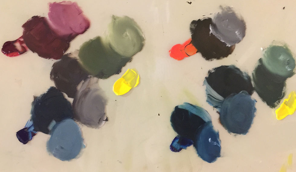 Lastly, above is a mix of Alizarin crimson, Ultra-marine blue and Cadmium yellow and to the right of this is a mix of Cadmium red, Ultra-marine blue and Cadmium yellow. These are mixed into darks and chromatic greys as above.