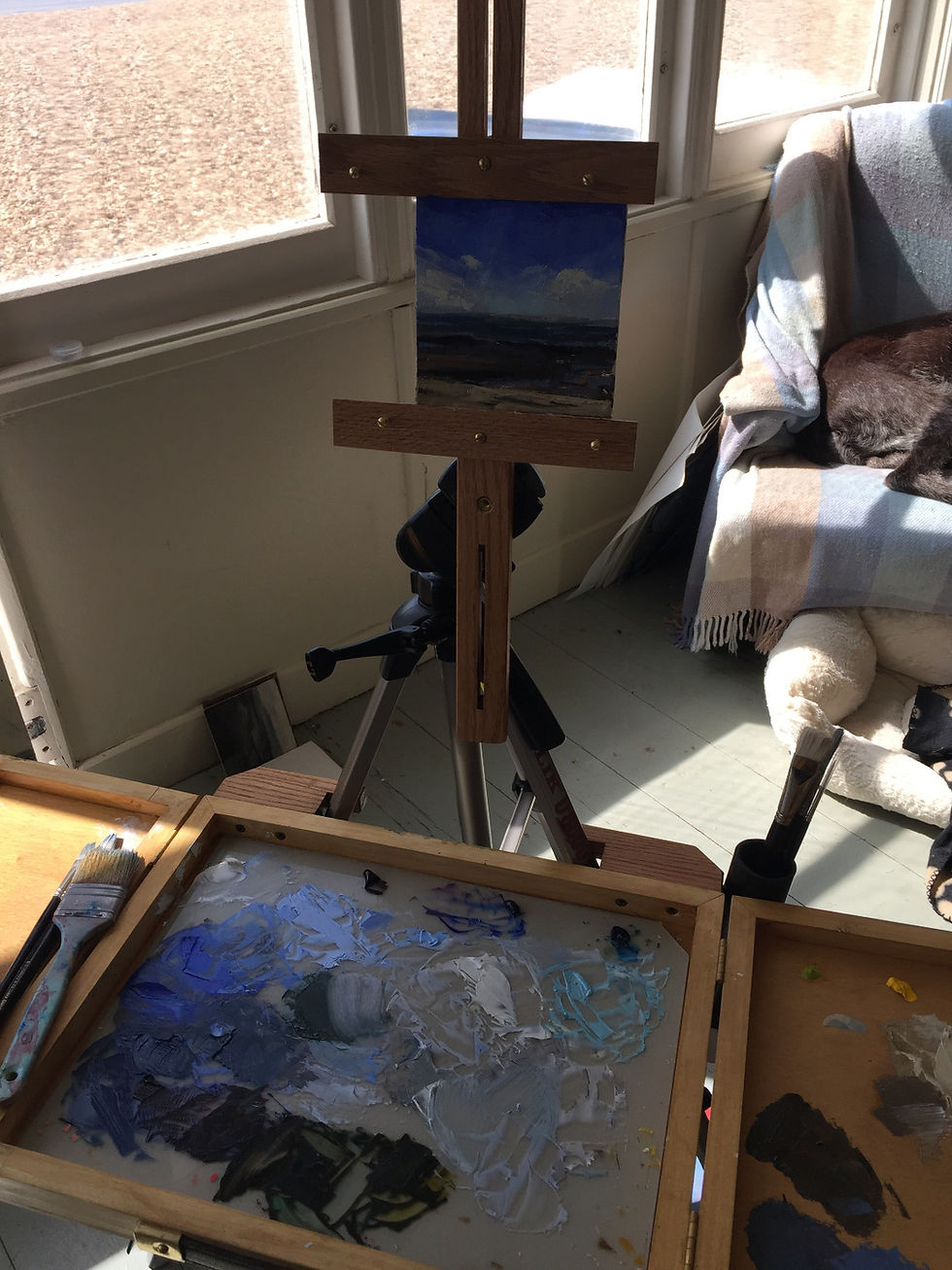 What a joy to have the opportunity for a few hours of painting in my favorite place. It was great to set up a studio space inside today out of the chilly Easter wind. The fire was lit the front door was open and my colours were out.