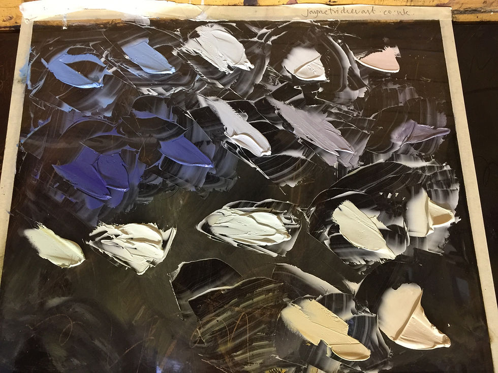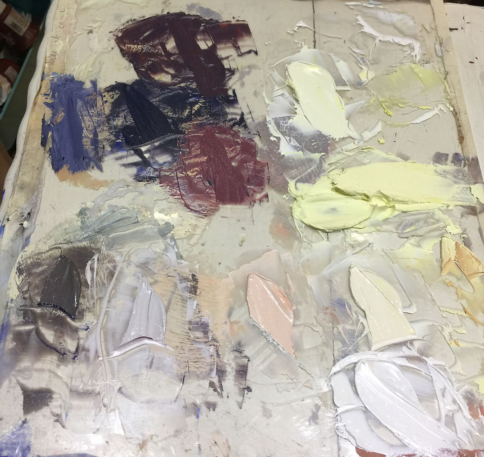 From here I switched to oils where I could take my time mixing families of colours that connect to each other and create a harmony and balance to the painting and to some of these oil pigments I added cold wax both for its surface texture and for its quality when I strike through it or write into it.